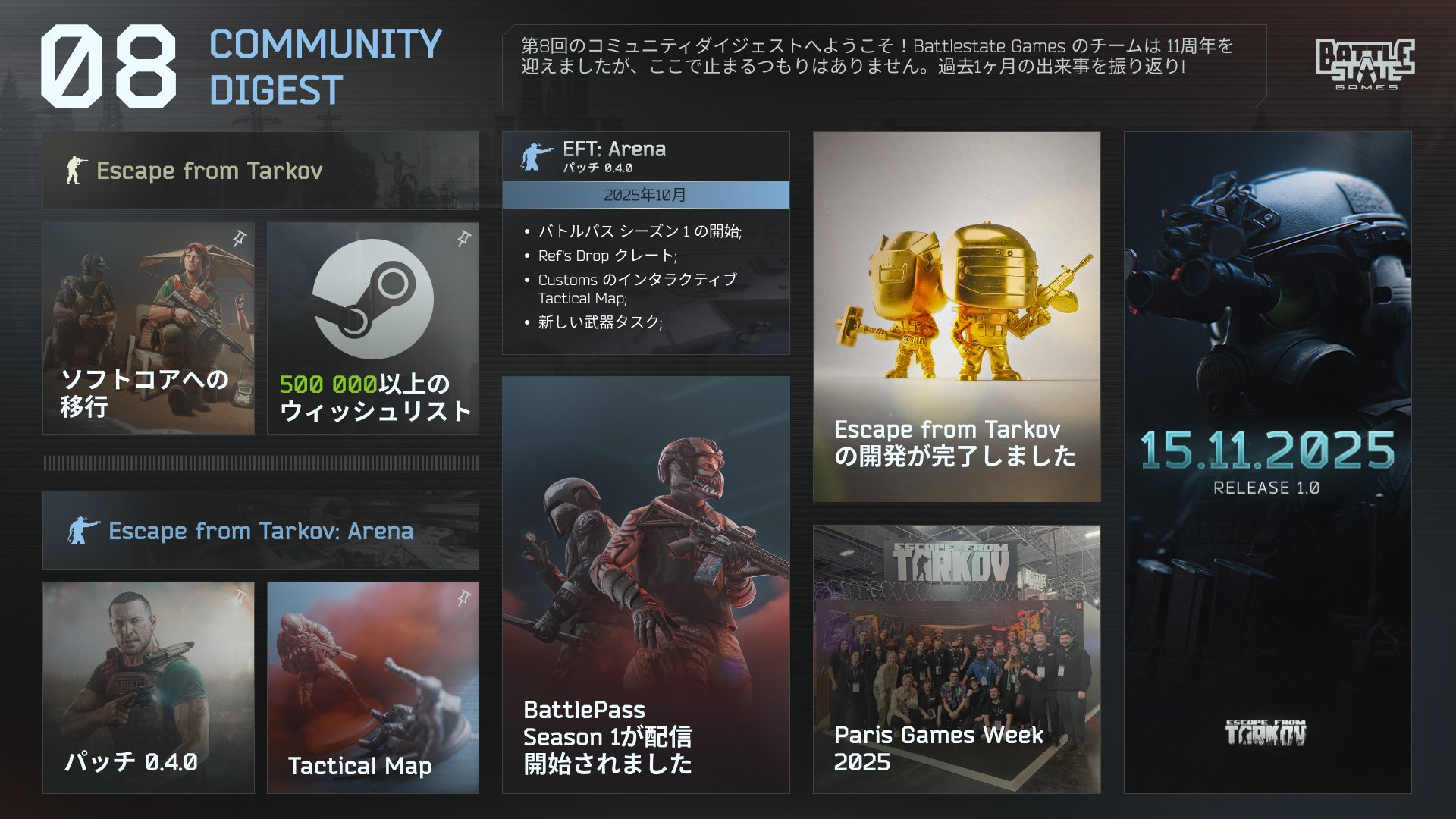 今月はBSGチームがParis Games Week 2025に参加し、 Escape from Tarkov と Tarkov Arena のアップデートを公開しました。