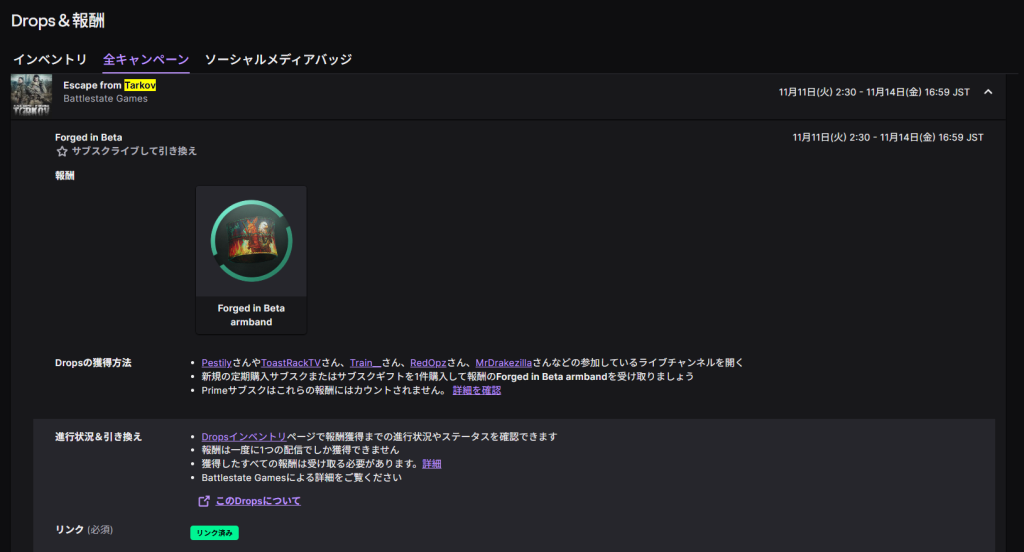 他の細かい詳細はTwitchのDrops詳細ページを各人で確認してください。