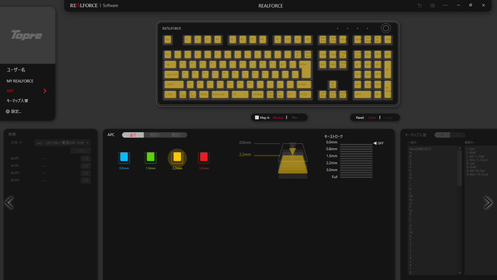 • 感想:GX1は30段階のAPCが設定できます。押下1mmから30mmまでの30段階に割り当てることが出来ます。先ほどの分割スペースキーもAPCが設定できますが、4段階までです。