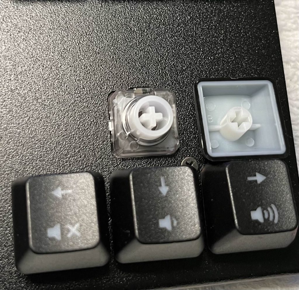 メカニカルキーボードでよく使用されている「CHERRY MX」のキーキャップのはめ込み部分の形状は「+」になっています。そのため、基本的には市場に大量にあるCHERRY MX対応キーキャップの取り付けは出来ません。