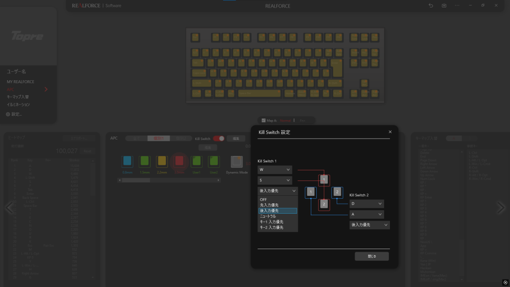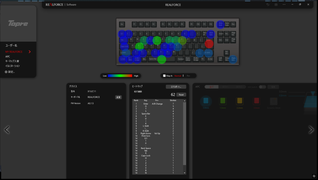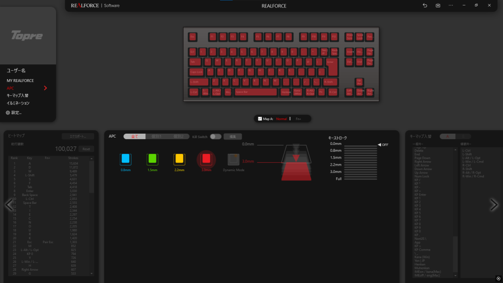 「自分があまり使用しないキーはどれ?」など分からないこともあると思います。キー設定ができる全ての製品に付属するソフトにおいてある機能かまでは分かりませんが、今回使用した公式のソフトではヒートマップが付属しています。