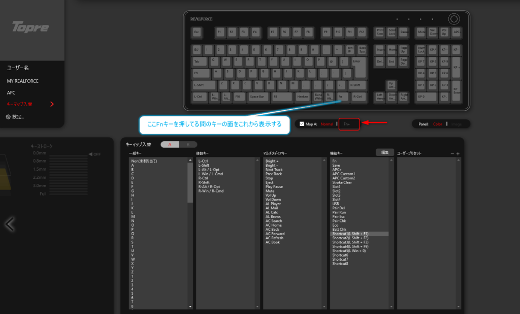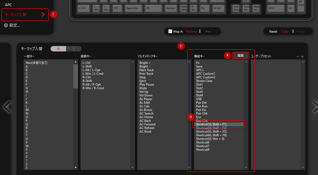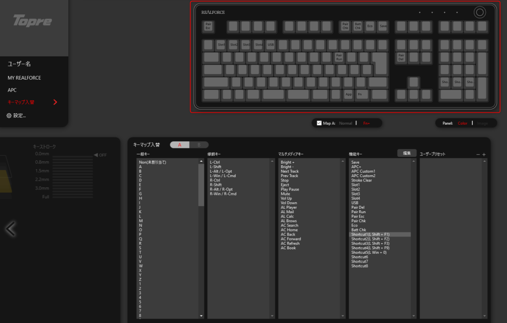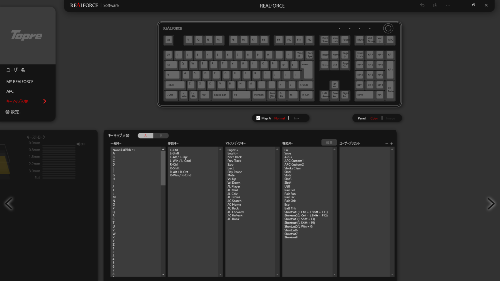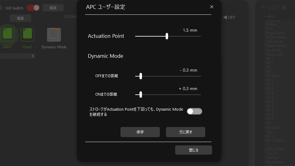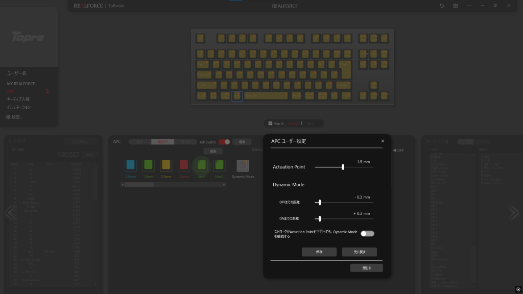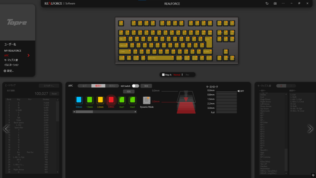 Dynamic modeは人によっては感じにくいかも。でも細かく見ると結構違いが分かる。 - キーマップの入れ替え機能は1面をかなりいじる人にとってはすごくありがたい。