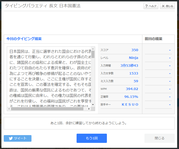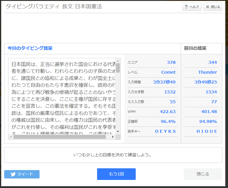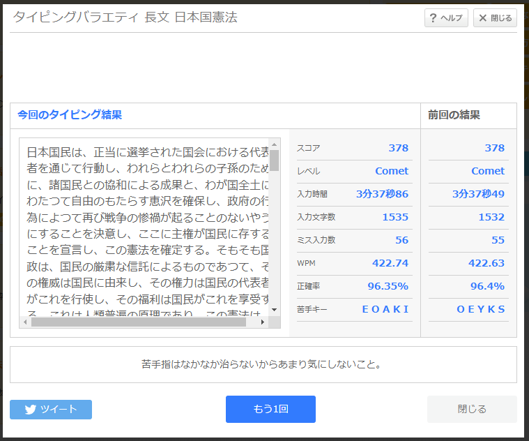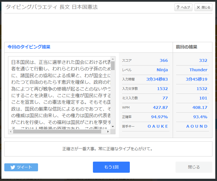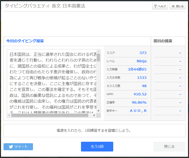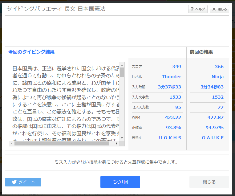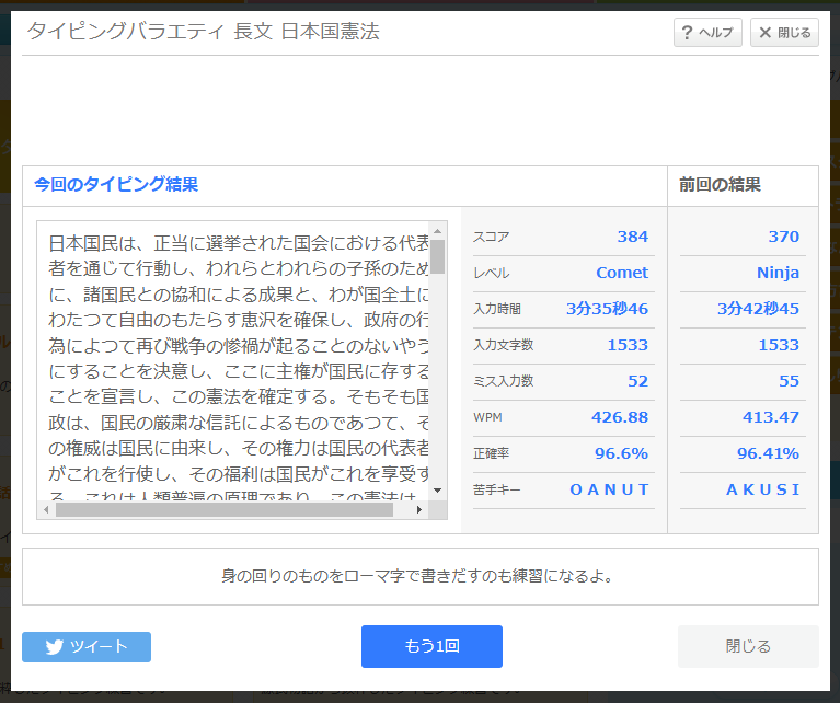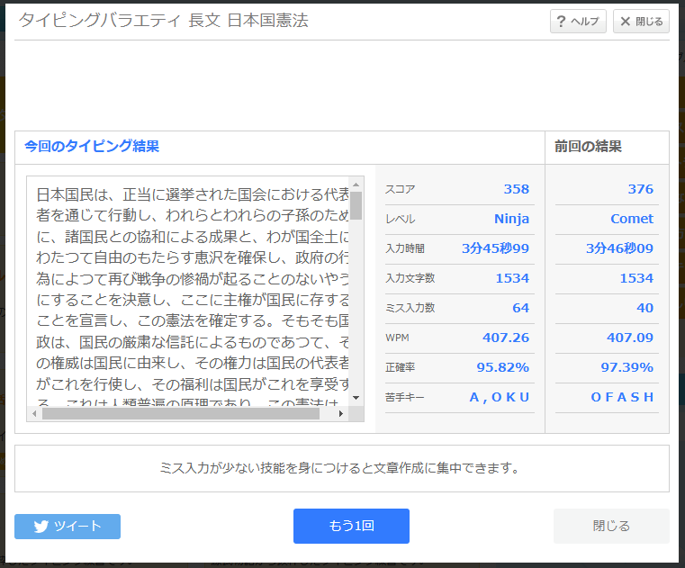 検証はeタイピングの日本国憲法(長文)約1500字を対象にしました。